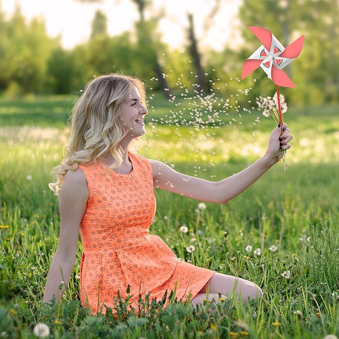 - You will get: 24 pieces pinwheels, and come with 24 pieces plastic sticks, enough quantity for you to use with your friends and family, please pay attention that the windmill was not pre-assembled