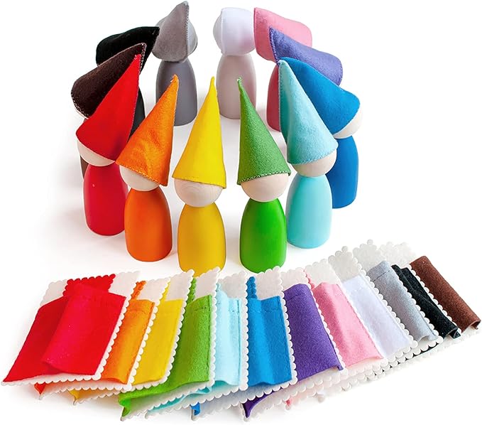 - π INCLUDED: 12 colored wooden peg dolls 3.35 in; 12 felt sorting hats; 12 felt beds; a wooden tray to keep all in place in your Montessori room; Combines with our sorters with cups and balls, smaller Montessori dolls, building blocks, etc