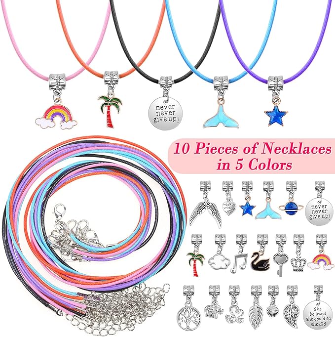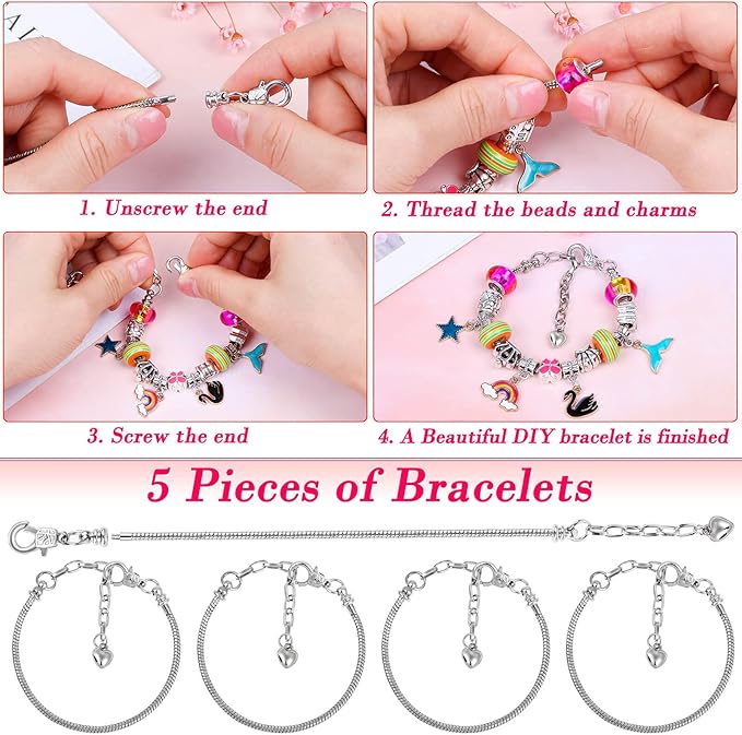 - GREAT GIFT IDEAS: Thrilez DIY charm bracelet making kit for girls come with 30 metal spacer beads, 20 pendant charms with dangle, 20 rainbow beads, 10 glass beads, 5 snake chain bracelets, 10 necklace, 1 gift box and 1 user manual. This jewelry making kit is great for DIY arts and crafts