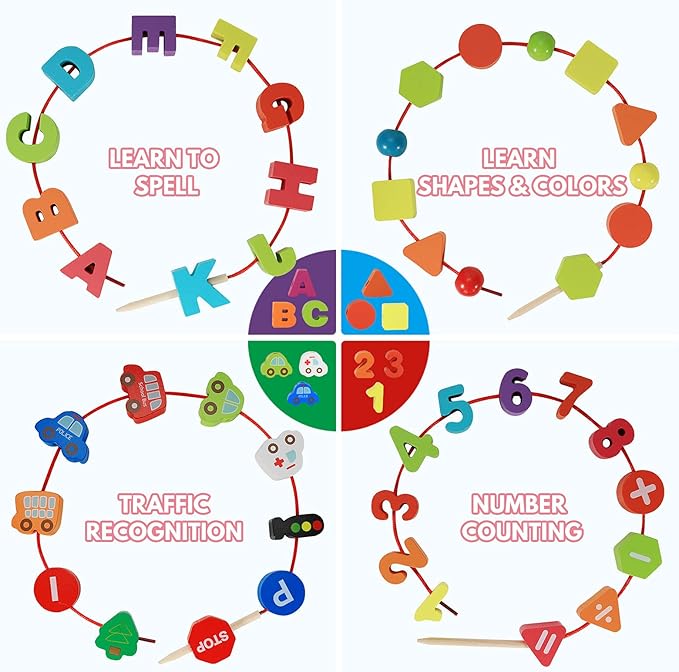 - 【Montessori Wooden Toys for 3 4 5 6 Year Old Boy Girl】- Toddlers Montessori toys is suitable for preschool kids baby! For 36 month old babies to learn numbers 0-9, alphabet letters A-Z, geometric figures and colors, as well as to satisfy the curiosity of 3 years old kids about animals, this wooden stringing toys provides a fun way for toddler to learn new things. The perfect montessori wooden toys is an ideal toy gifts for 3 year old girls and boys.