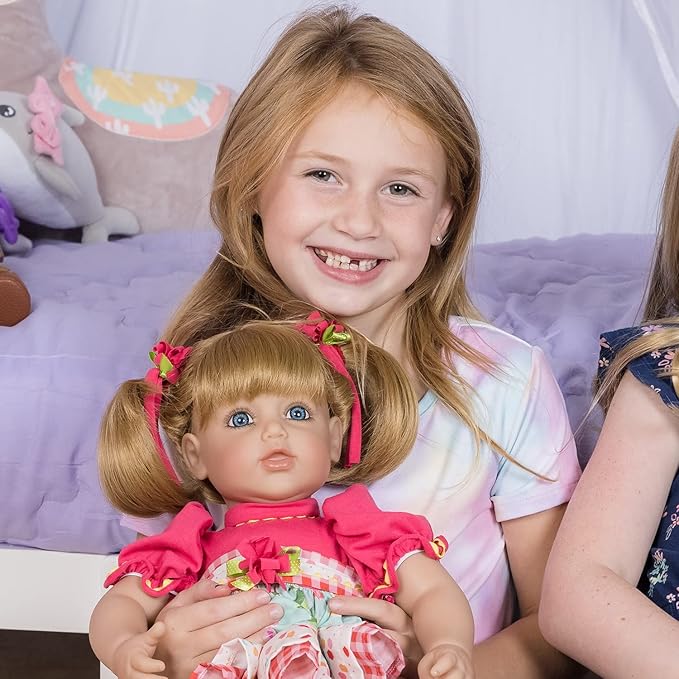 - REALISTIC DETAILS - Her blue eyes are outlined by lifelike, hand-applied eyelashes, plus her mouth is slightly opened. She has a hand-painted face, sandy blonde doll hair, and a light skin tone, and her bean-bag weighted body gives her that cuddly, lifelike feel.