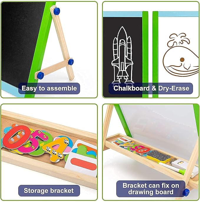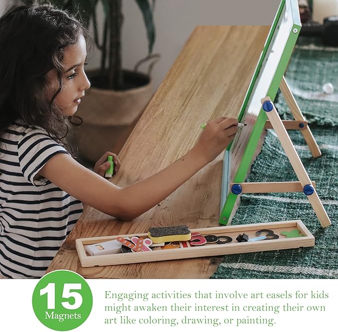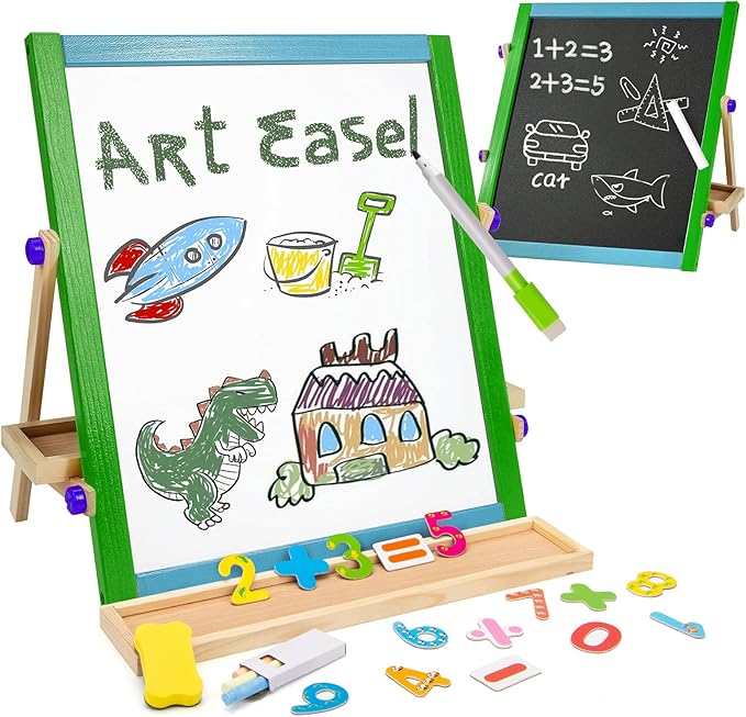- Double-Sided Tabletop Easel: The art easel for kids made of solid wood has a magnetic dry erase board on one side and a chalk board on the other.
