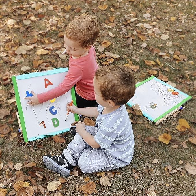 - Double-Sided Tabletop Easel: The art easel for kids made of solid wood has a magnetic dry erase board on one side and a chalk board on the other.