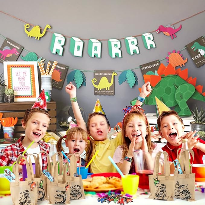 - COMPLETE DINOSAUR PARTY FAVORS SET:Package include 48 pcs, serve for 12 kids. 12 dinosaur keychain(8 styles), 12 tote non-woven dinosaur party bags(6 style bags), 12 dinosaur slap bracelets(10-12 styles), 12 sheet glow in dark dinosaur tattoos. Great dino party favors for kids birthday party