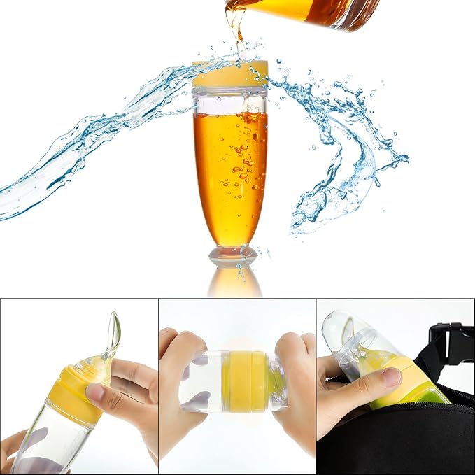 - Using and cleaning: simply fill the silicone bottle with the pureed food and gently press until the desired amount collects on the spoon to feed baby; Disassemble the bottle and put it into water after using