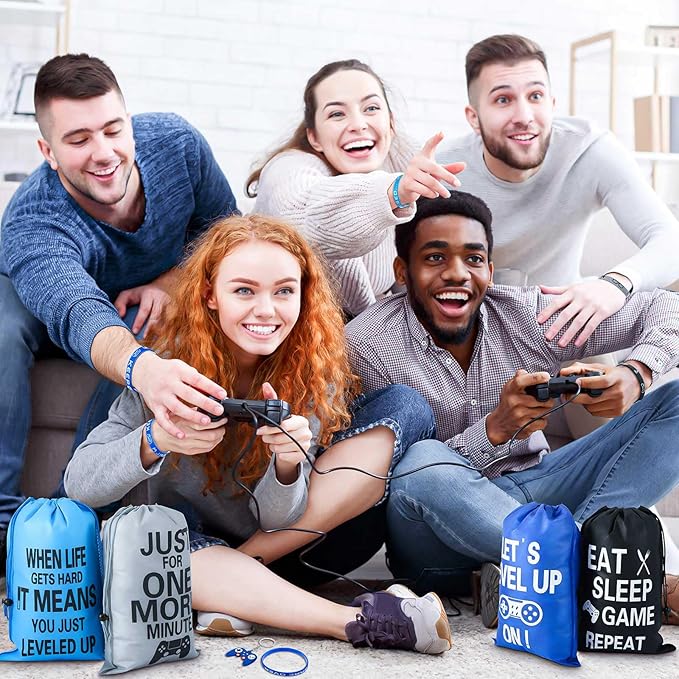 Shappy 36 Pieces Includes Video Game Bracelets Wristbands Gaming Party Bags with Drawstring Game Controller Keychains for Video Game Birthday Party Favors Supplies