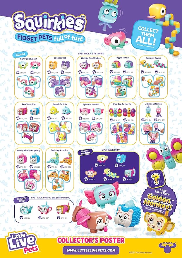 - SPECIAL SQUIRKIES! Explore the mystery single packs to find the Ultra Rare Golden Monkey or the 3 pack assortments to discover Squirkies with a metallic finish!