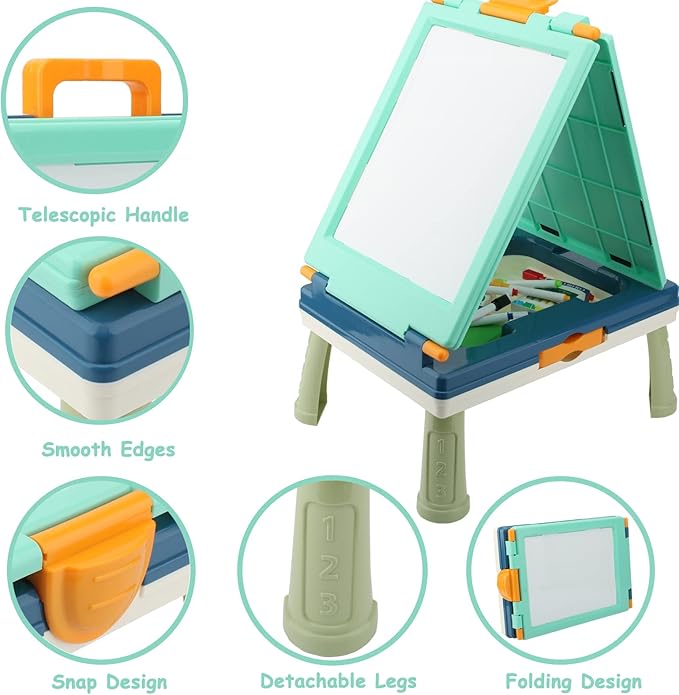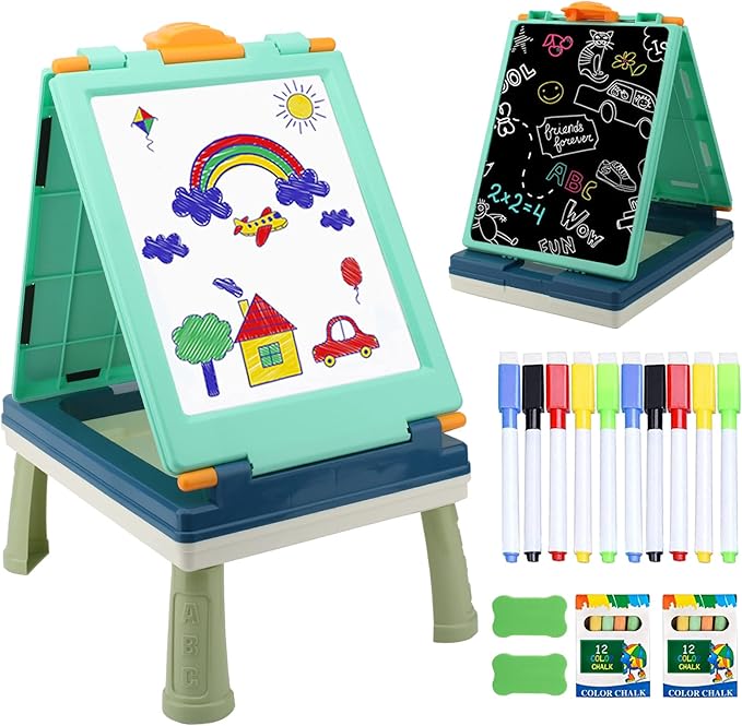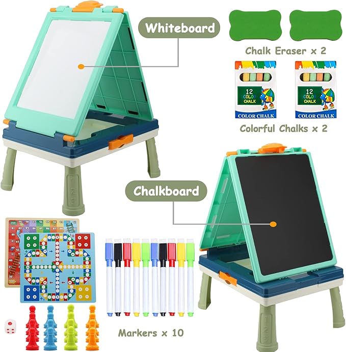 - Double-sided Board: Our kids art table easel contains a whiteboard and blackboard for both learning and entertainment. The package contains accessories such as brushes, erasers, flying chess, etc. Ruikytech tabletop easel is great to support multiple children to create drawing or playing flying chess together