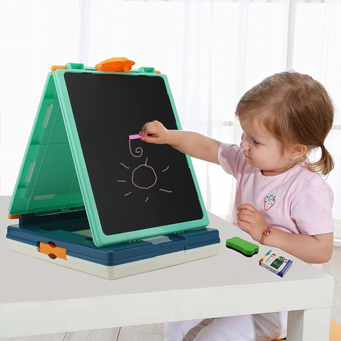 - Portable and Foldable: This portable desktop chalkboard easel is easy to operate and can be used when opened, no need other assembly tools. With the special foldable hand suitcase design, the easley stand can be folded flat to saving space after playing which is easy for kids to carry out and practice drawing at anywhere they want