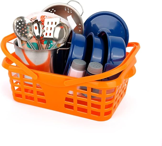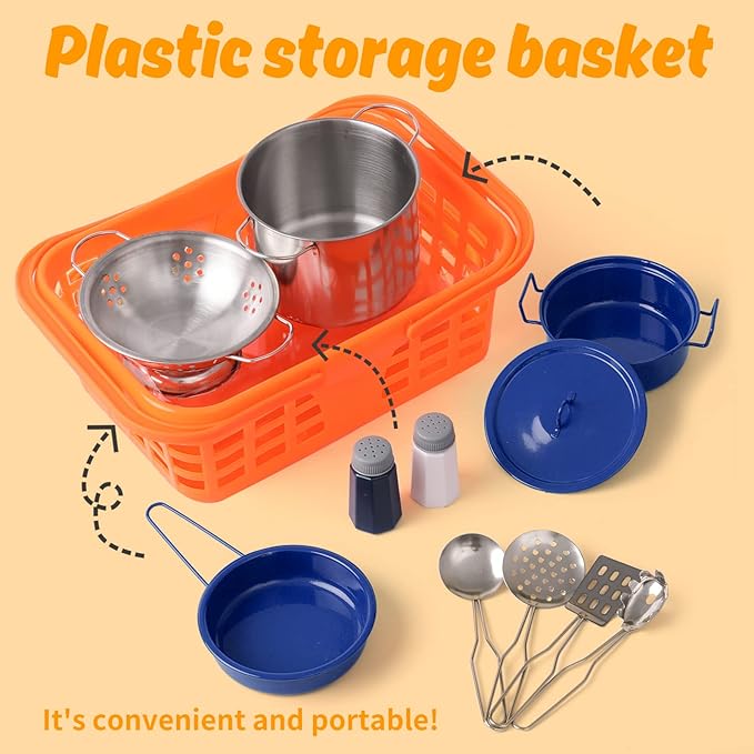 - πγ Kids Play Kitchen Accessories γβ 14PCS set includes: One colander, one stockpot, one pan and one low pot, comes with one covers, one spatula, one ladle, one draining spoon, one spaghetti server, one table mat and 2 spice bottles. There is also a carrying basket to store all the kitchen utensils.