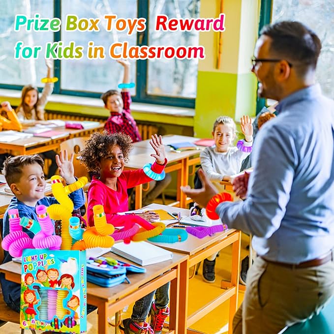 - Classroom Treasure Prize Box Toys for Kids- Glow party favors bags best as classroom treasure box prizes for kids toddlers.Our light up tube are soft and fun as return gift for kids birthday. Pop tubes make top notch party favor goody bags, Both kids and adults will delight in playing with them.