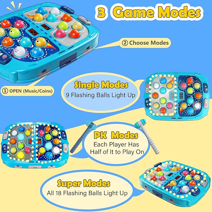 - 3 Modes for More Fun: Single mode, PK mode, super mode. Ditch the TV, cellphone, computer, both parents and kids, begin a whack mole family game to increase the parent-child interactive, reignite family night