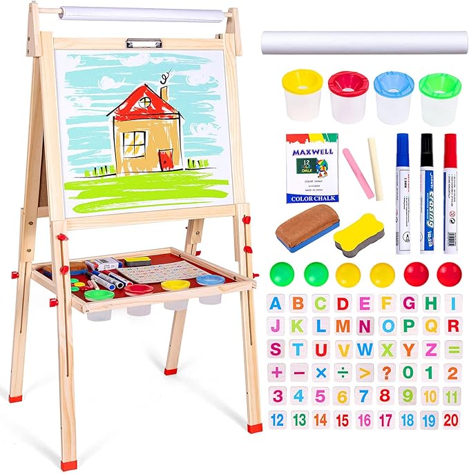 - KIDS WOODEN STANDING ART EASEL & PAPER ROLL: This pine wooden kids easel includes a magnetic dry-erase board, chalkboard, locking paper-roll holder