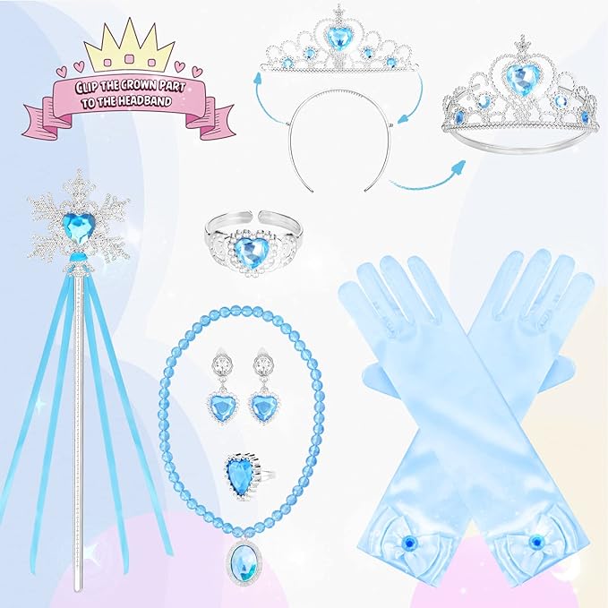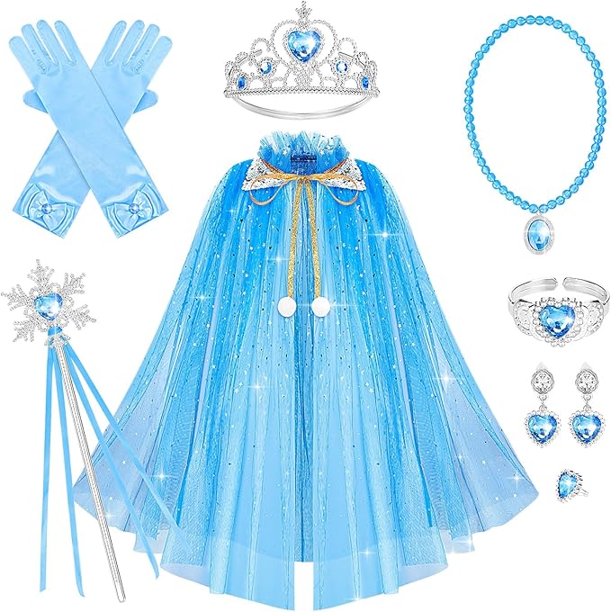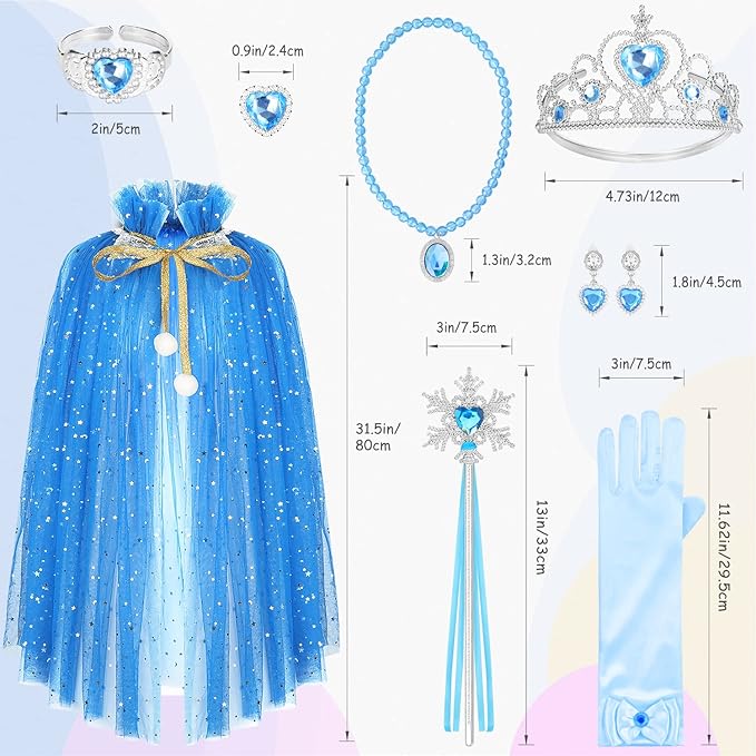 - Princess Dress Up Set: Come with princess cape, princess crown tiara, princess magic wand, princess gloves, bracelet, ring, necklace, clip-on earrings. Rich dress up accessories for your little girls.