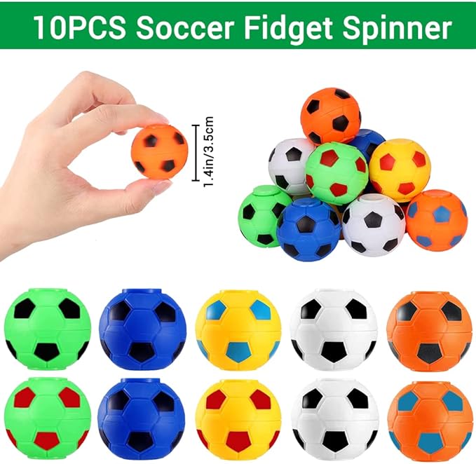 - FOOTBALL PARTY FAVORS SET:You will receive 10 PCS fidget spinner football ball,10 football word silicone bracelet keychains,10 soccer temporary tattoos,10 pieces of the football whistle,10 football Plastic bags,10PCS football slap bracelets,52PCS football stickers. Enough quantity for you to share these football party present with your kids and friends.