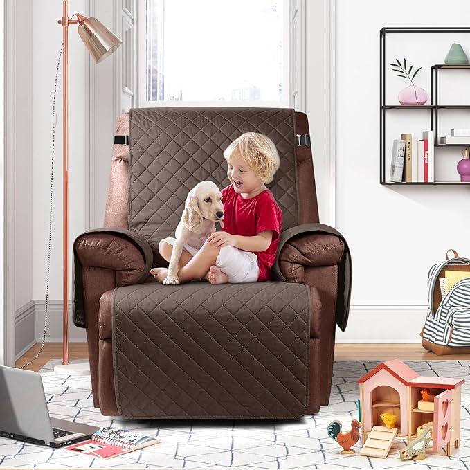 KinCam 100% Waterproof Recliner Chair Cover, Reclining Couch Covers for Pets, Dogs, Recliner Couch Slipcover Furniture Protector with Elastic Straps for Kids(23.6", Brown)