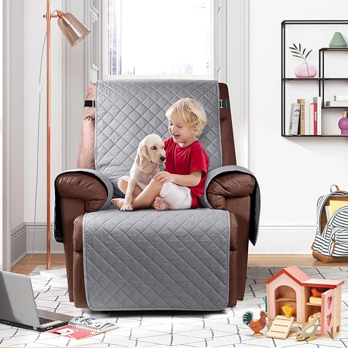 KinCam 100% Waterproof Recliner Chair Cover, Reclining Couch Covers for Pets, Dogs, Recliner Couch Slipcover Furniture Protector with Elastic Straps for Kids(23.6", Light Gray)