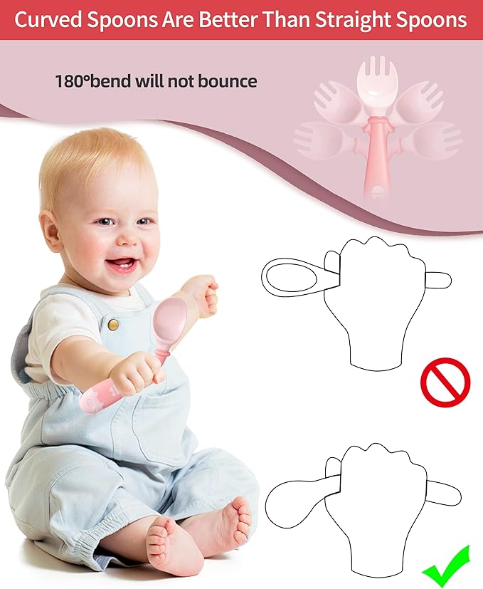 - [Ergonomic Design] The tableware is specifically made to help babies with their grip training. It can bend in any direction without rebounding, enabling the infant to eat at different angles and encouraging the development of agility and hand-eye coordination.