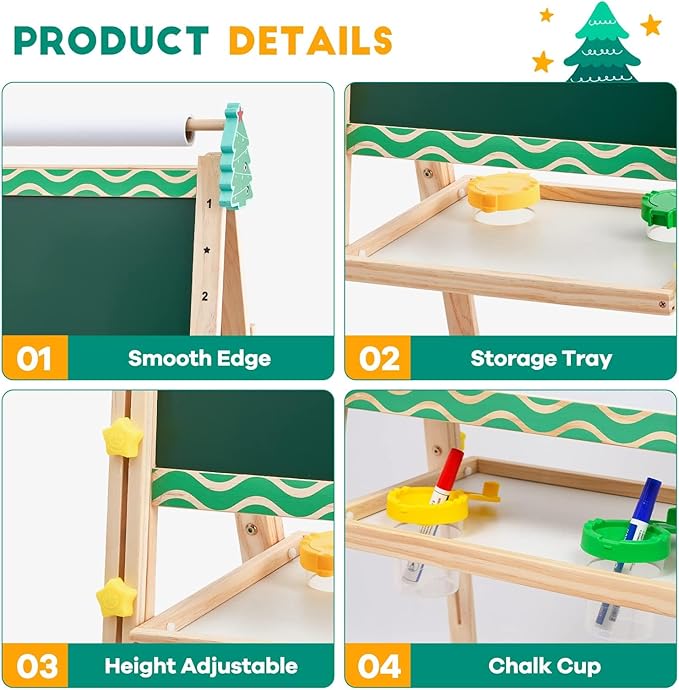 - 🎄Integrated Double-Sided Easel: The double-sided drawing board is perfect for your children to be creative. Note: Please tear off the protective film before use. The blackboard needs to be wiped with a damp cloth.