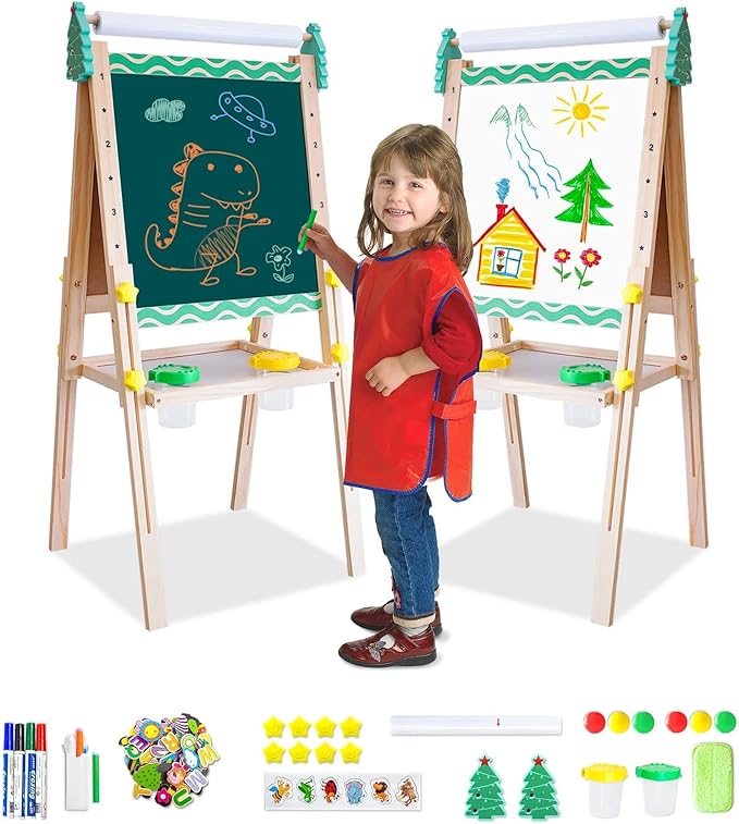 Wooden Art Easel for Kids with Paper Roll Height Adjustable Standing Easel Double-Sided Easel with Whiteboard Chalkboard Storage Tray Painting Accessories Gift for Boys Girls Toddler Ages 3+
