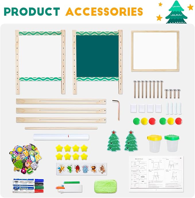- 🎄Integrated Double-Sided Easel: The double-sided drawing board is perfect for your children to be creative. Note: Please tear off the protective film before use. The blackboard needs to be wiped with a damp cloth.