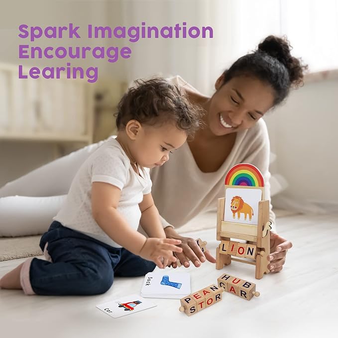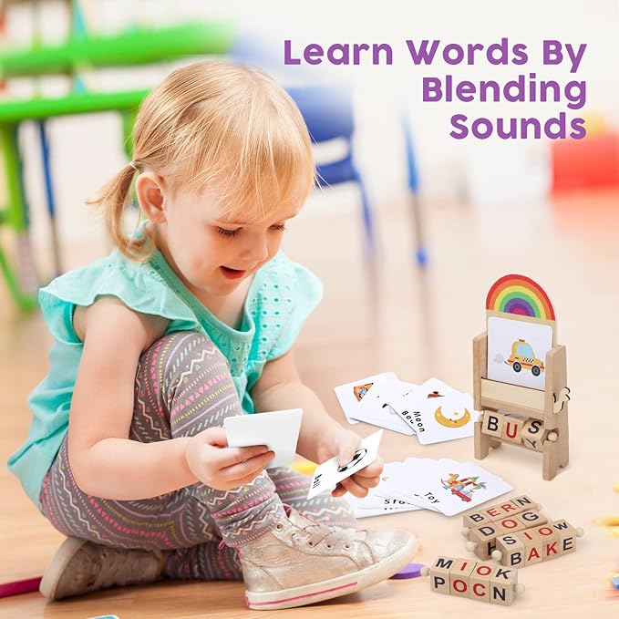 - Many Ways to Learn! For beginners, simply place the cards in the rainbow easel and have your toddler match up the letters they see with the wooden blocks. Helps with letter recognition and memorization. For advanced learners, slide the wooden bar across the card to hide the word. Now your child has to spell the word out on his/her own. They’re on their way to being a phonics super star.