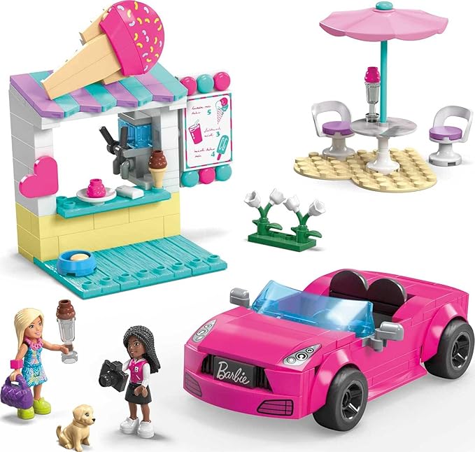 Mega Barbie Car Building Toys Playset, Convertible & Ice Cream Stand with 225 Pieces, 2 Micro-Dolls and Accessories, Pink,