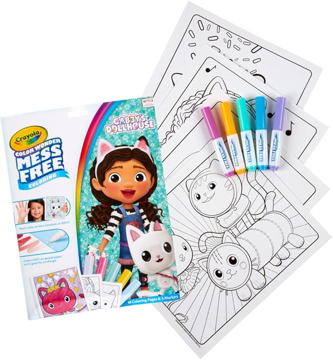 - COLOR WONDER SET: Contains 18 Gabby’s Dollhouse Coloring Pages and 5 Color Wonder Markers.