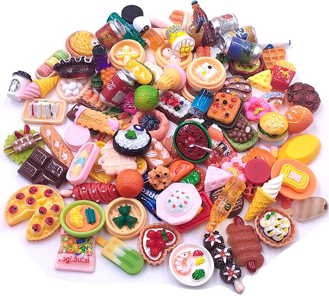 - SUPER VALUE ——100pcs miniature food toys set come with different style mini food, nclude: food, beverage bottles, beverage cans, burgers, French fries, cakes, milk tea, bread, chocolate, ice cream, milk, beverages and more. Enough quantity and style offers you starting pretend food play,help to relieve stress, develop creativity and imagination, bringing you lots of fun.
