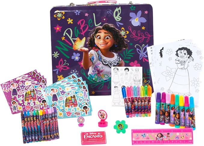 - DELUXE ENCANTO ACTIVITY SET INCLUDES: Tin carrying case (12 x 10.5), 30 coloring sheets, 568 stickers, 12 crayons, 8 markers, 8 mini gel pens, stamp pad, giant stamper, stamper, eraser, and ruler (6 inch)