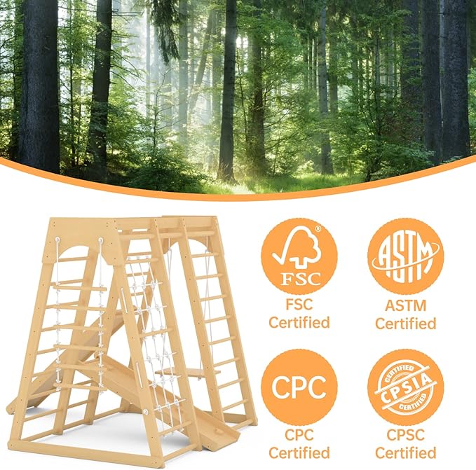 - 【100% Natural Wood, Safer to Use】Our Toddler indoor playground is built with purely natural wood, the product body does not contain plastic materials harmful to the body, and has received a CPC (ASTM&CPSC certification) certificate.YueYueFa's jungle gym for toddlers age 1-8 focus on sustainability and thoughtful details, please enjoy their smooth, burr-free Appearance (Suggestion: put a soft carpet under the Toddler indoor playground, which can act as a cushion if your child falls while playing)