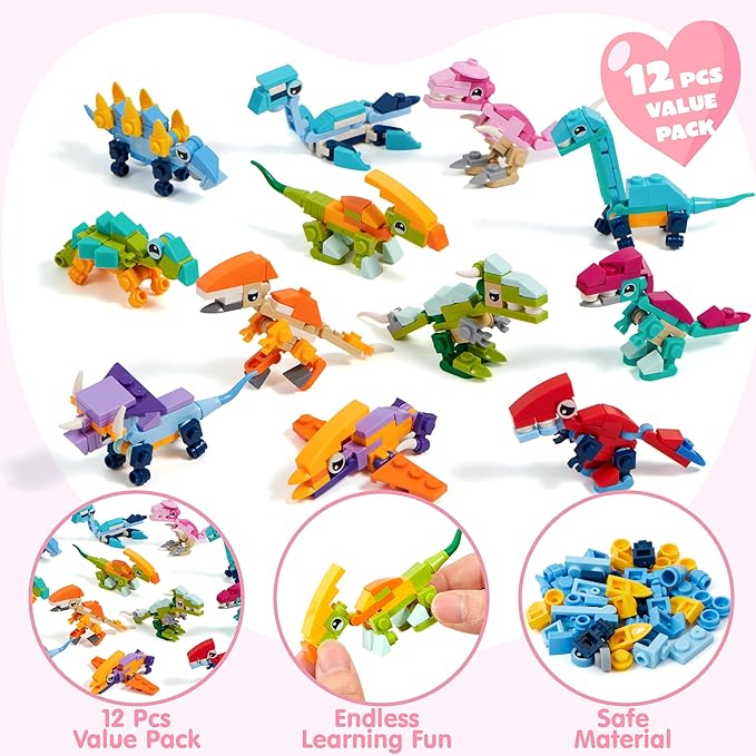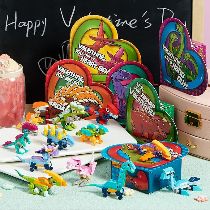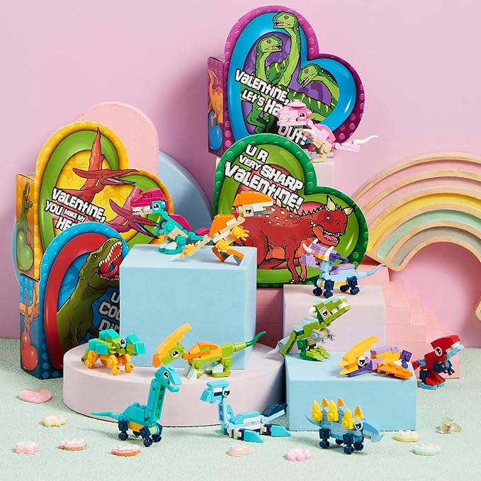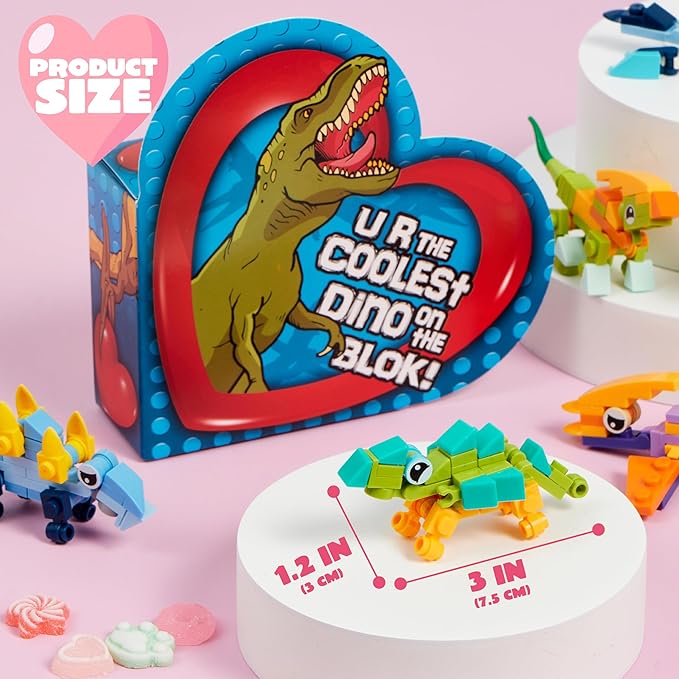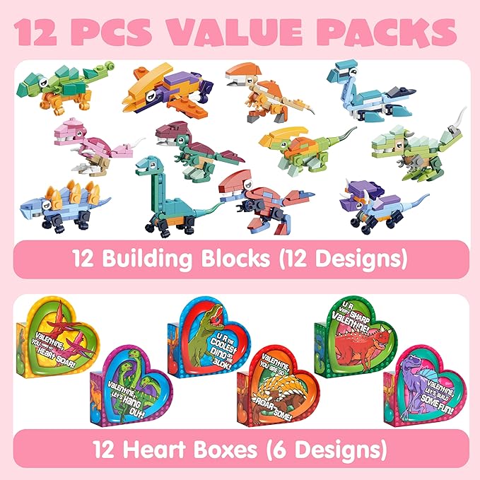 - SUPER VALUE. Our Valentines Day Heart shape boxs with Animal Building Blocks include 12pcs Dinosaur animal building blocks in random design. Each boxes has love note that perfectly match the hearts and Dinosaur Building Blocks.