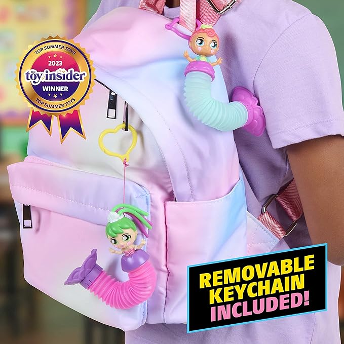 - POP TUBE MERMAID TAILS: Each doll includes a 3-piece pop tube mermaid tail. Stretch, bend and style the doll’s tail in so many ways. The top of the mermaid tail is removable and becomes a mini skirt for the doll. The fin of the mermaid tail is a fidget spinner that detaches from the pop tube. Mix and match mermaid tails, fins and mini skirts for even more looks.
