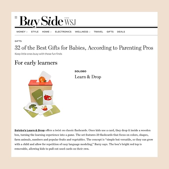 - Learning + Education: A Montessori-inspired wooden toy with 50 learning flash cards for children 12 months and up. The removable wooden top has a large slot allowing the cards to be dropped in.
