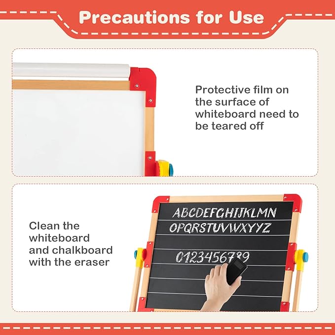 - Easy Assembly & Rich Accessories: The package comes with step-by-step instructions to provide you with hassle-free assembly. This kids art easel set includes many art and learning accessories: 26 x magnetic letters, 1 x paper roll, 2 x dust-free chalk, 1 x eraser, 1 x whiteboard marker. Precaution for use: protective film on the surface of whiteboard need to be teared off.