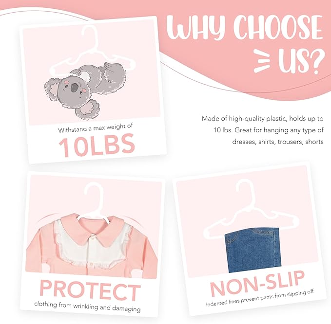 - Baby Hangers For Nursery: The small hangers are suitable for kids aged 0-7 years old, from baby clothes to toddler and child-sized garments. Plastic kids hangers are easy to clean and are less likely to collect dust or dirt than other types of kid hangers, making them an ideal choice for baby girl hangers.