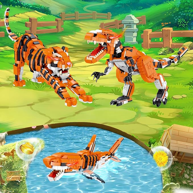 • 【Realistic Shape Design】Tyrannosaurus rex toy can move its head, Body, Shoulders, Jaw, Legs and tail. Tiger toy can move its jaw, Legs, Feet and tail. Shark toy's head, Body and tail can Swing left and right, the fins can swing up and down. More than 10 flexible joints are special design to pose in different poses, Satisfying the love of building block fans for animal model theme, Helps provide hours of pretend play for block fans