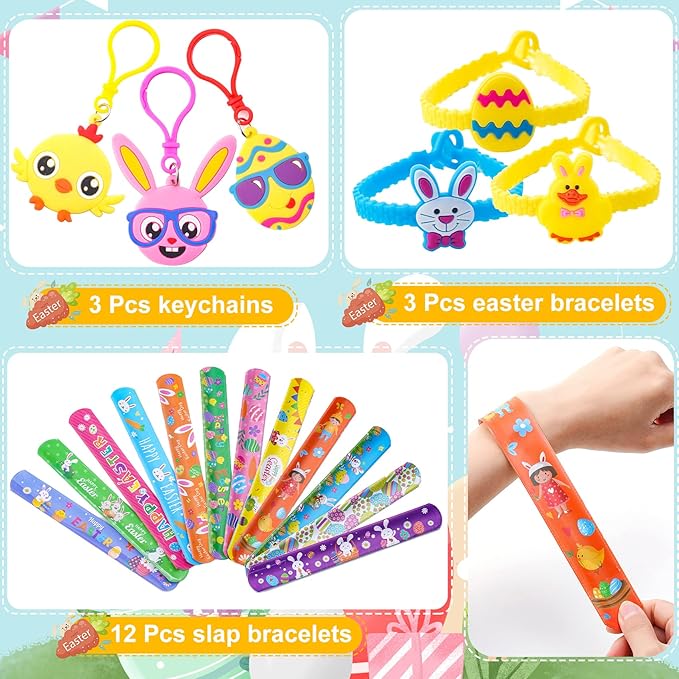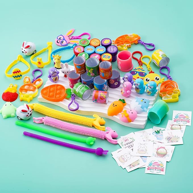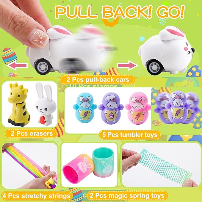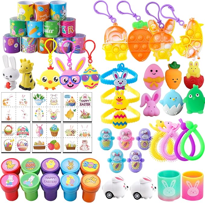 - Super Value Pack- Our 100Pcs Easter egg fillers set assorted 13 different Easter themed novelty toys. Including 12Pcs easter slap bracelets, 10Pcs easter stamps, 6Pcs easter mochi squishies, 4 Pcs pop keychains, 3Pcs easter keychains, 3Pcs easter silicone bracelets, 4Pcs bunny stretchy strings, 48Pcs easter tattoos, 2Pcs pull back cars, 2Pcs Easter erasers, 2Pcs magic spring toys, 5 Pcs tumbler toys. Solve the difficulty in collecting different small toys for Easter gifts for children.