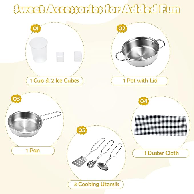 • 【Sweet Accessories for Added Fun】 There is no need to buy accessories, as the kids kitchen play set is complete with 1 cup & 2 ice cubes, 1 pot with lid, 1 pan, 3 cooking utensils and 1 duster cloth. All of these can greatly encourage your little chef to play and learn to identify different cooking supplies.
