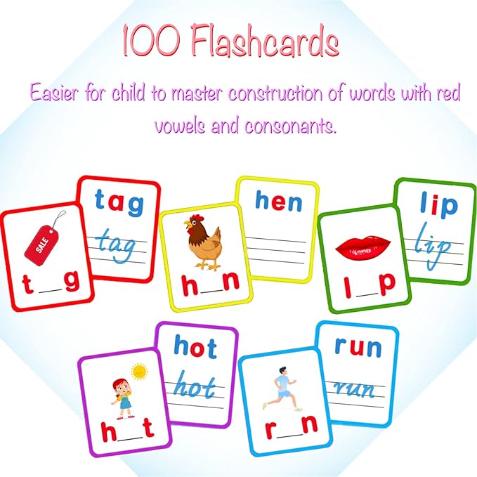 - 2 Learning Levels by Color Coded: 100 pcs of CVC word cards are separated into two learning levels by colors, Rose red cards are higher level and only consonants are given, Other colored cards are basic level with all vowels given. Each card has a scene pictures that matches the word, Kids can fill in the word and learn words, Improve their reading, writing and spelling skills