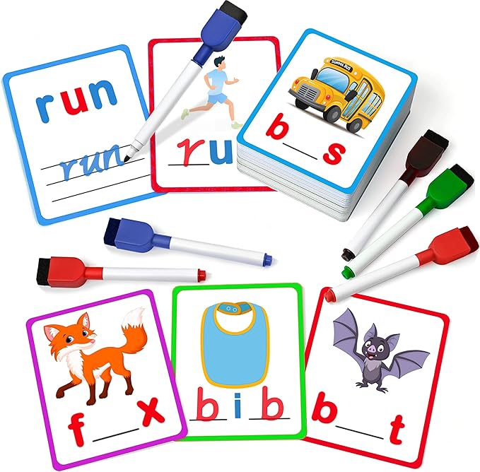 - Short Vowel Spelling CVC Flashcard Set: Contains 100 Pcs double-sided CVC sight word cards and 6 dry-erase markers, easy to write and erase, wipable for repeated use. Also comes with a portable bag for easy storage and carry, The flashcards have perfect size for children to read and write easily
