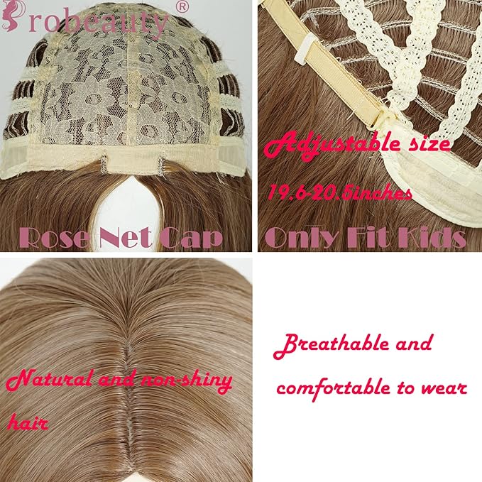 Probeauty Brown Curly Wig for Kids Girls, 19.6 Inches Long Wavy Middle Parting Heat-Resistant Synthetic Fiber Hair + Wig Cap for Halloween Costume Cosplay
