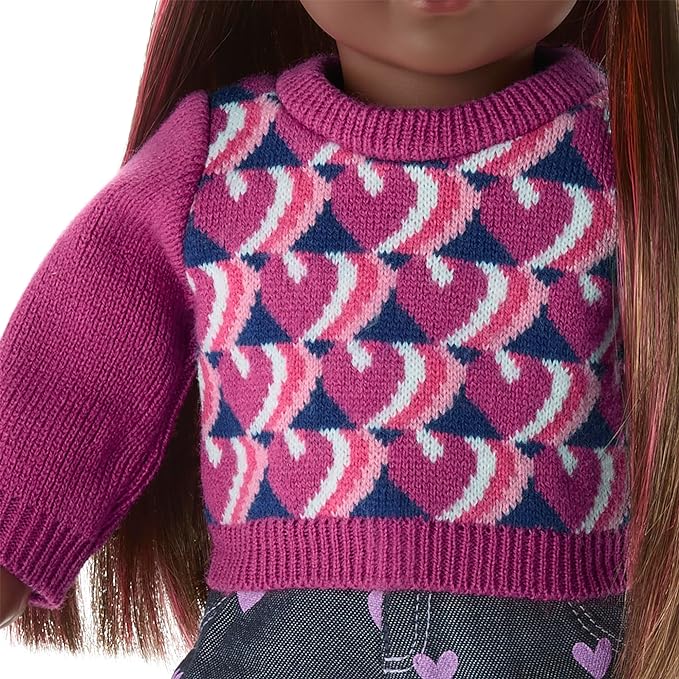 - A burgundy sweater with a graphic heart design on the bodice and a pair of jeans with a lavender heart pattern