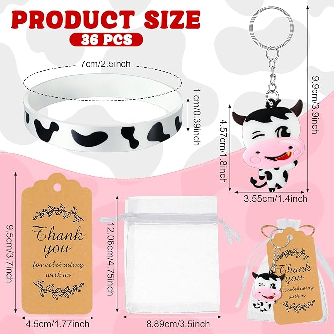 - Nice Combination: cow party decorations include 36 pcs silicone bracelets, 36 pcs cow keychains, 36 pcs organza bags as well as 36 pcs thank you tags with strings, rich, colorful and beautiful set is prepared for your cow themed party supplies