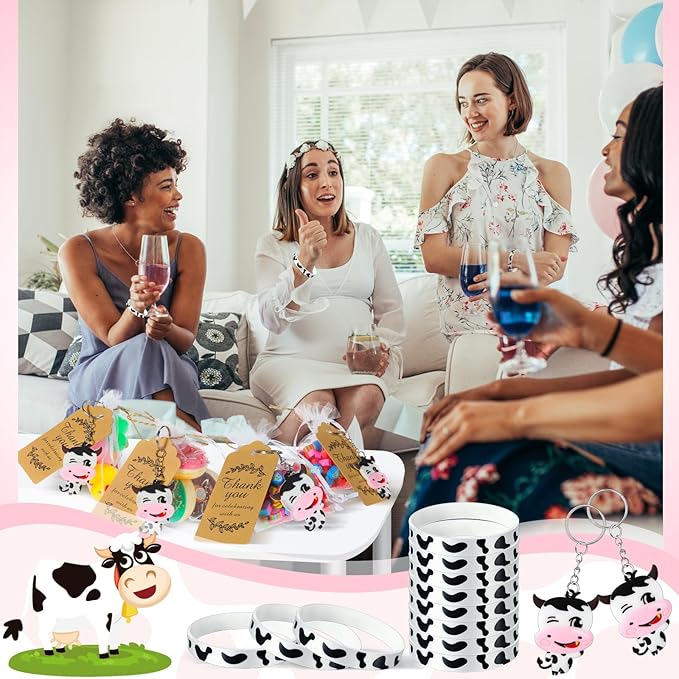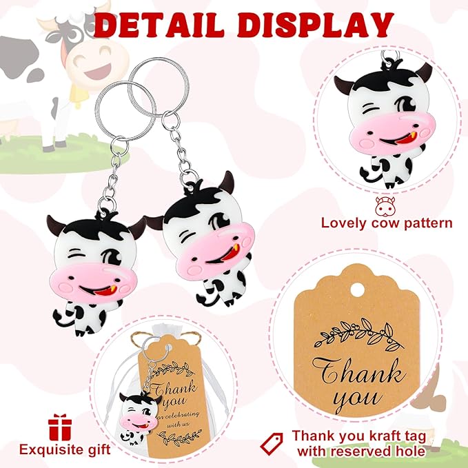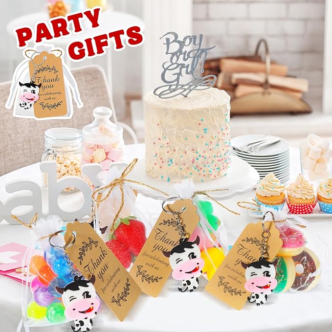 Sasylvia 144 Pcs Cow Party Supplies Include 36 Sets Cow Keychain Thanks Kraft Tags Rubber Bracelets White Organza Bags Cow Party Favors Cow Themed Party Decorations for Baby Shower Girl Boy