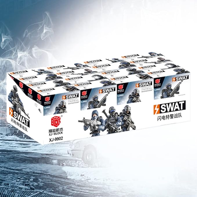 - 【Unique Design】This is a police team kit building block model which is very cool and also comes with 8 policeman and a variety of Swat team prop accessories : Guns, weapons packs, shields, helmets.Mini size action figures, 1:36 scale, each measures about 2.2" tall, figure can stand alone.