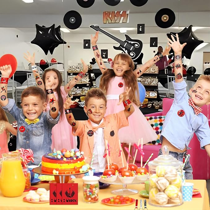 - Rock and Roll Party Supplies: Rock and roll theme birthday party supplies for fans of this rock music. These rock birthday party supplies full of assortment of cool rock style, well-designed by the designer slap bracelets and key chains, vivid badge and temporary tattoos are sure to stand out at parties, rock toys will create a big hit and great fun for your party