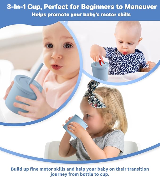 - 【TRAINING CUP & SOFT BIB】-Multi-use training cups triple as toddler drinking cups or baby food storage, Soft silicone protects baby's developing teeth. designed to fit baby’s little hands and mouth. The baby bib is soft and adjustable, and a large pocket for collecting any scattered food or liquid, Which Keeps your little one feeling comfy and clean.