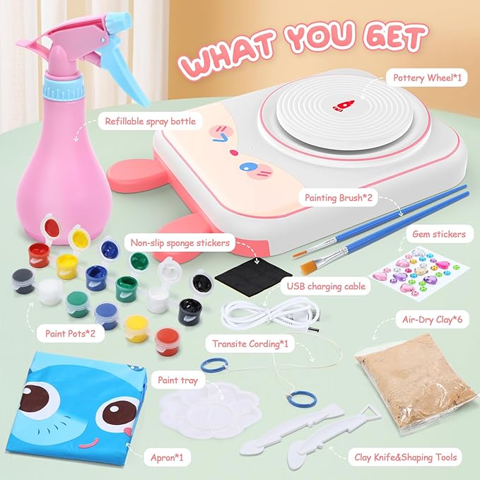 - ALL-INCLUSIVE SET: With our pottery wheel kit for kids age 9-12, you'll receive everything your child needs to get started on their artistic journey. The set includes 1 pottery wheel kit, 6 air dry clays, 1 refillable spray bottle, 2 painting brushes, 2 painting kits, 1 painting tray, 1 transite cording, 1 USB charging cable, 1 non-slip sponge sticker, 1 gem sticker, 1 apron, and 2 clay knife & shaping tools.