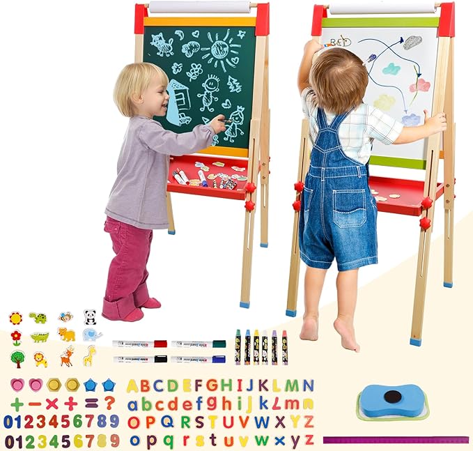Easel for Kids Double-Sided Kids Easel with Paper Roll Wooden Art Easel Whiteboard & Chalkboard Adjustable Standing Toddler Easel with Accessories Gift for Boys and Girls